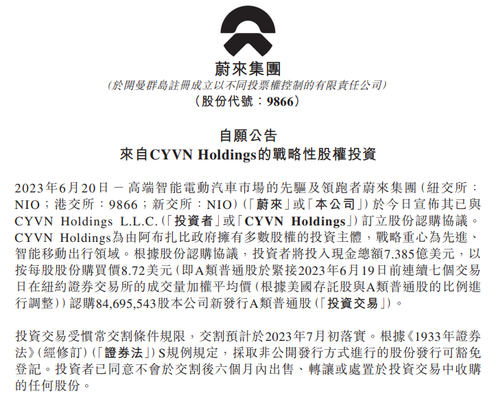 6月20日,蔚来发布公告,宣布和阿联酋阿布扎比政府旗下投资机构CYVN Holdings签订股份认购协议,接受这家来自中东的资本的投资。