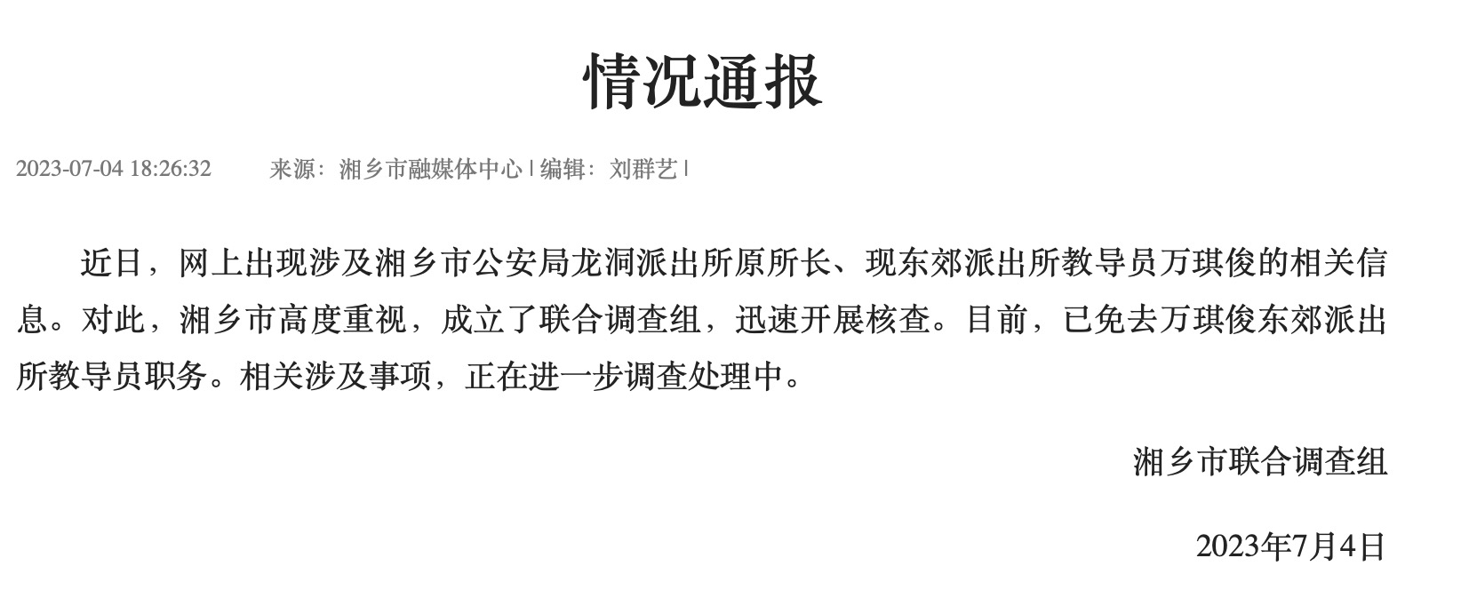 湘乡市联合调查组7月4日发布情况通报,近日,网上出现涉及湘乡市公安局龙洞派出所原所长、现东郊派出所教导员万琪俊的相关信息。对此,湘乡市高度重视,成立了联合调查组,迅速开展核查。目前,已免去万琪俊东郊派出所教导员职务。相关涉及事项,正在进一步调查处理中。