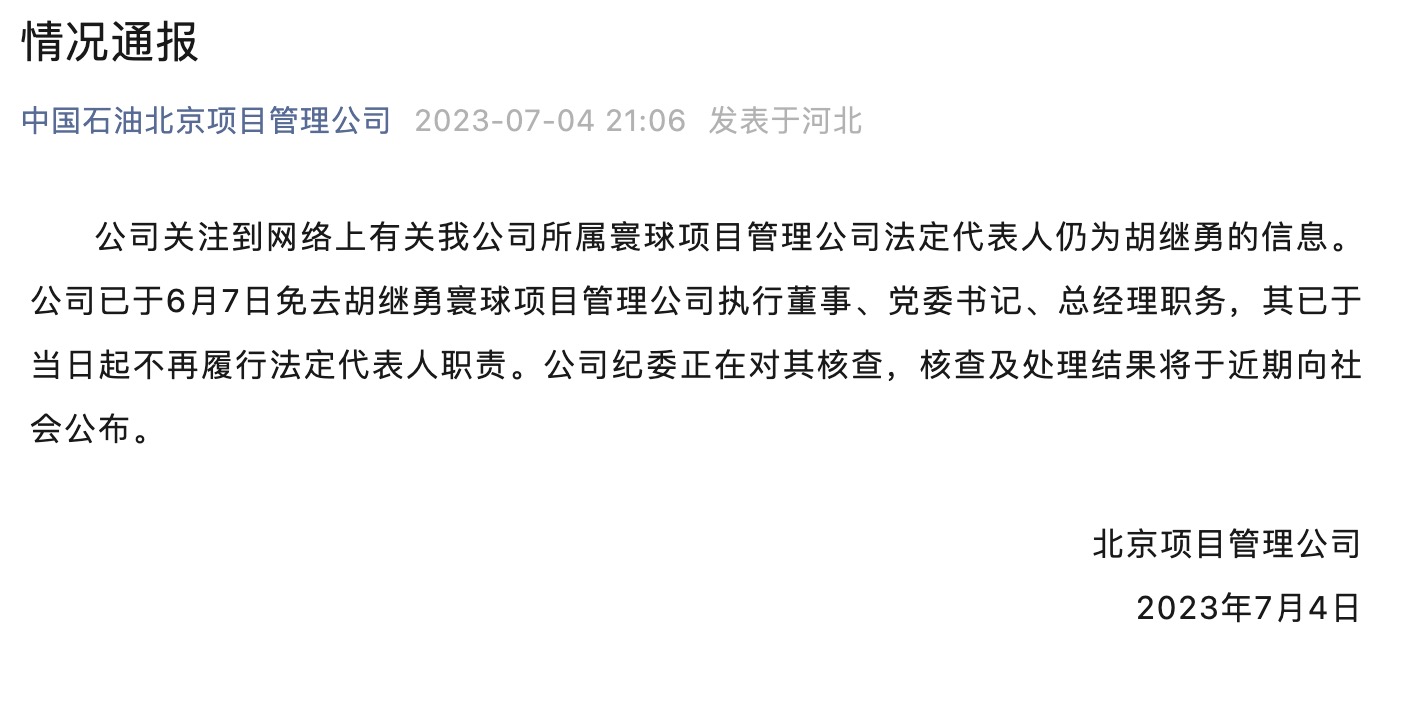 7月4日,中国石油北京项目管理公司发布情况通报:公司关注到网络上有关我公司所属寰球项目管理公司法定代表人仍为胡继勇的信息。公司已于6月7日免去胡继勇寰球项目管理公司执行董事、党委书记、总经理职务,其已于当日起不再履行法定代表人职责。公司纪委正在对其核查,核查及处理结果将于近期向社会公布。