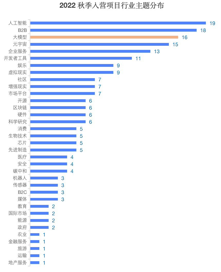 在奇绩创坛2022年11月举办秋季路演日中,陆奇投了55个项目,“预训练大模型”方向的项目一口气就出现了16个,与之同步的还有19个项目和人工智能沾边,与之前相比,这一次的赛道分布明显更聚焦AI。