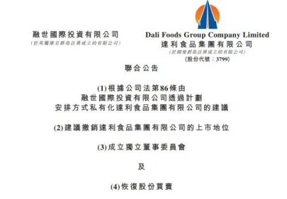 公告显示,达利食品及要约人融世国际要求董事会向计划股东提出建议,建议通过计划安排方式拟私有化达利食品,建议撤销达利食品于联交所的上市地位。