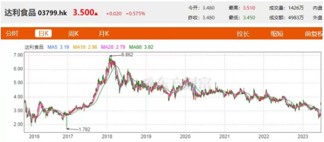 新消费财研社了解到,达利食品上市后,股价曾在2018年1月31日达到6.86港元/股的高点,此后便呈现逐渐下跌趋势,2023年5月23日至6月1日,其股价甚至连降7个板,最终跌至2.44港元每股。