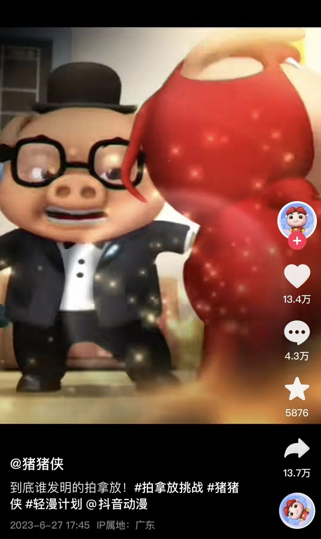 若时间倒回2020年,刷抖音时便总会见到这样的内容:先是手部抖动搭配“要开飞机要电视机要CD机要mp3要冰淇淋要人民币不要太贪心”,直到女声唱起”聪明勇敢有力气,我真的羡慕我自己”,再出镜对口型或跳舞。红极一时的拍摄模板,选用的BGM正是早期《猪猪侠》的同名主题曲,由于在短视频平台迅速传播,也让“猪猪侠”冲上音乐软件热搜榜。