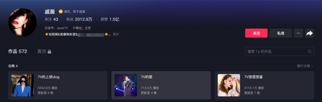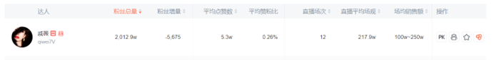 资料显示,戚薇的抖音账号拥有近2013万粉丝,是最早涉足直播带货的艺人之一。根据蝉妈妈数据,其账号场均销售额在100-250万元之间,平均场观近218万人次,在抖音平台是非常头部的达人。