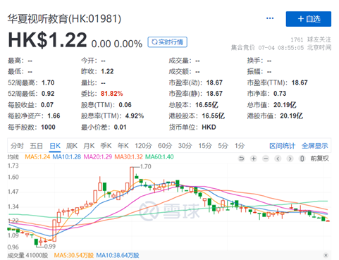 但在敲定与戚薇直播间合作的公告发布后,华夏视听教育的投资者却显得似乎有些“失望”。股价不但没有继续走高,反而在震荡中下跌,目前其股价从1.7港元降至1.22港元,缩水了近4成。