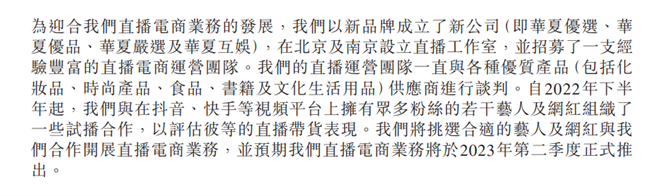 在3月底发布的年报中,华夏视听教育透露,公司成立了新公司华夏优选、华夏优品、华夏严选及华夏互娱在北京及南京设立直播工作室,并招募了一支经验丰富的直播电商运营团队。此前已在抖音、快手等平台上与艺人和网红进行了试播合作,预期直播电商业务将于2023年第二季度正式推出。也正是当初的这一消息带动了股价的持续上涨。