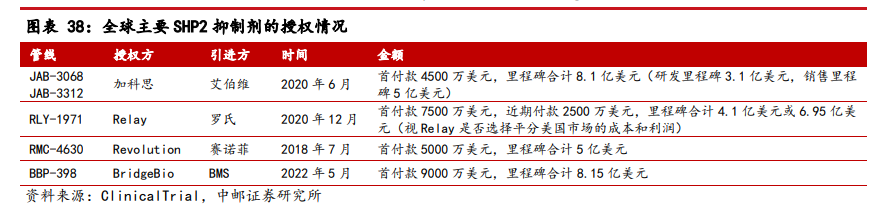中邮证券在2022年年底发布的一份研报称,SHP2抑制剂联用潜力备受关注,海外主要在研SHP2抑制剂均完成对MNC授权。