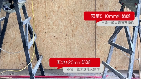 第六步:并且在中间需要预留5-10mm伸缩缝,打底板离地面≥20mm做为防潮处理。