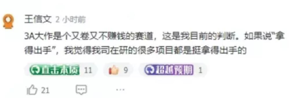 2022年底当叠纸曝光《百面千相》《无限暖暖》等项目时,就有人在莉莉丝内部论坛提问为何他们不搞大作?对此Kenny(王信文)的回复是“不做3A”。