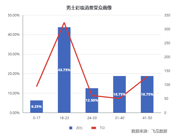 在男士彩妆消费市场中,消费受众以Z时代男性为主,0-23岁消费群体占比50%,其中18-23岁群体消费意愿最强,TGI达到323.12。