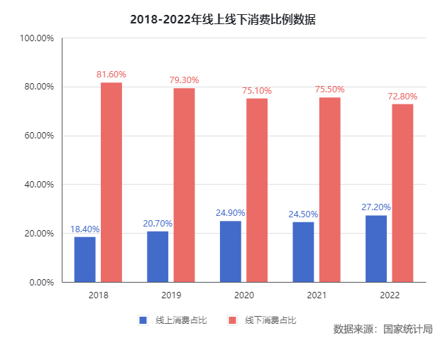 近五年来,线上消费金额在逐年上涨。到2022年为止,线上消费金额占比已达27.2%。