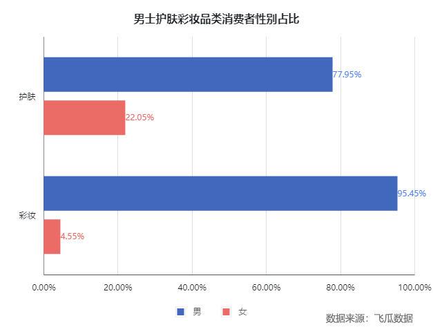 男士护肤品类中,女性消费占比22.05%,男性占比77.95%;男士彩妆产品消费者中也有4.55%为女性。