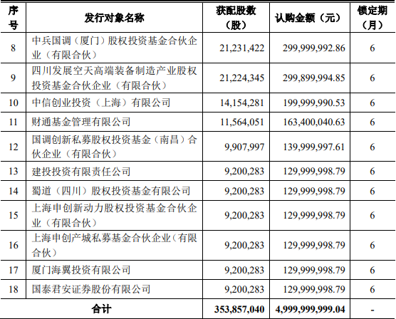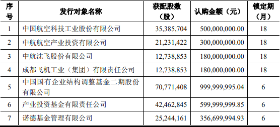 根据公告,本次发行对象为包括中国航空科技工业股份有限公司,中航航空产业投资有限公司,中航沈飞股份有限公司,国泰君安证券股份有限公司在内的18家对象。