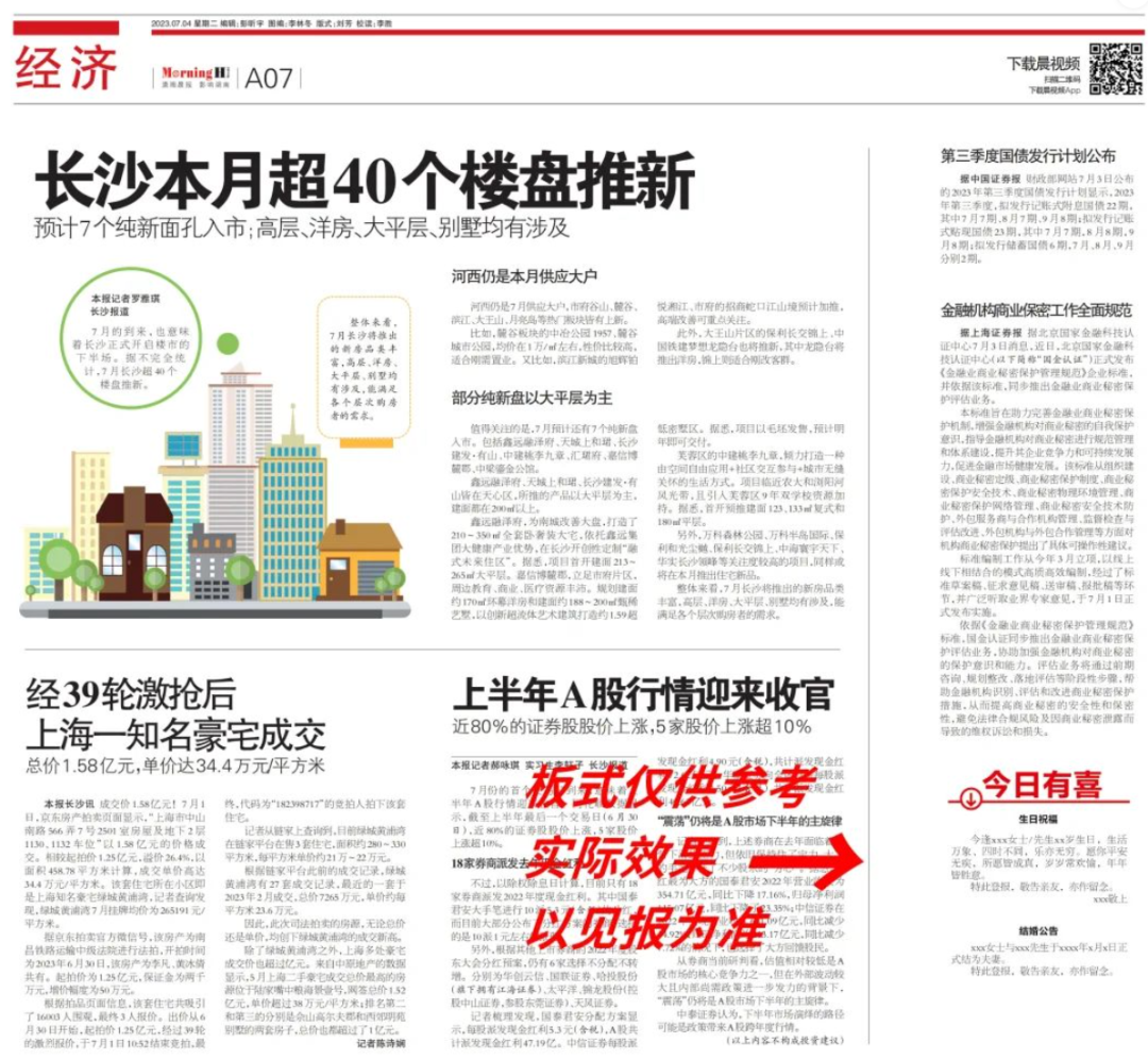 登报版面为《潇湘晨报》默认版面,版面大小参考:
