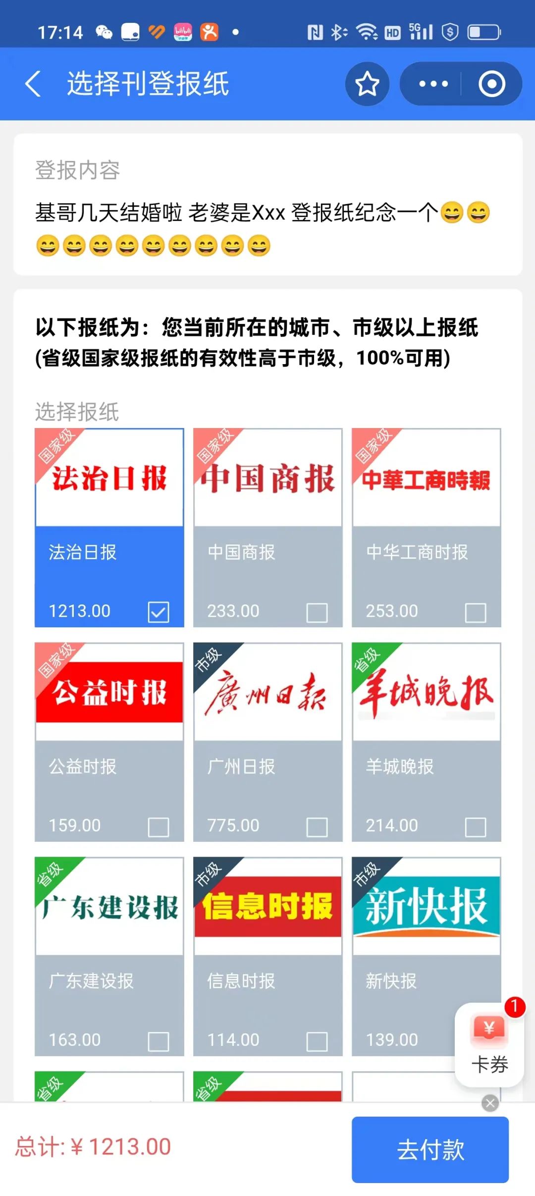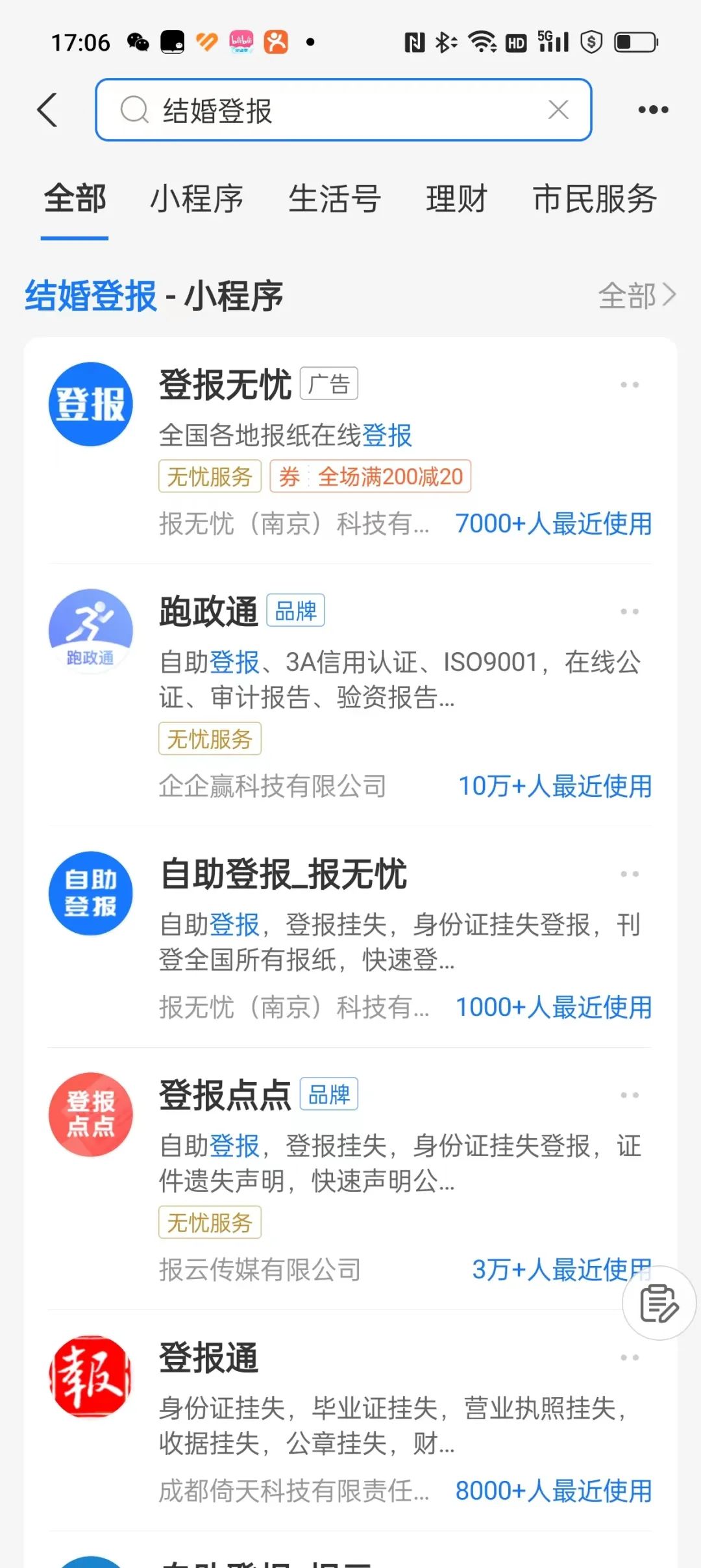 在微信或者支付宝上,搜索“结婚登报”,都能看到相关服务的广告。