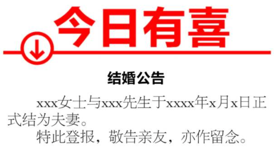 登报的结婚公告,大致内容为:“某某先生与某某女士在哪一天正式结为夫妇,特此公告,敬告亲友,亦作留念。”