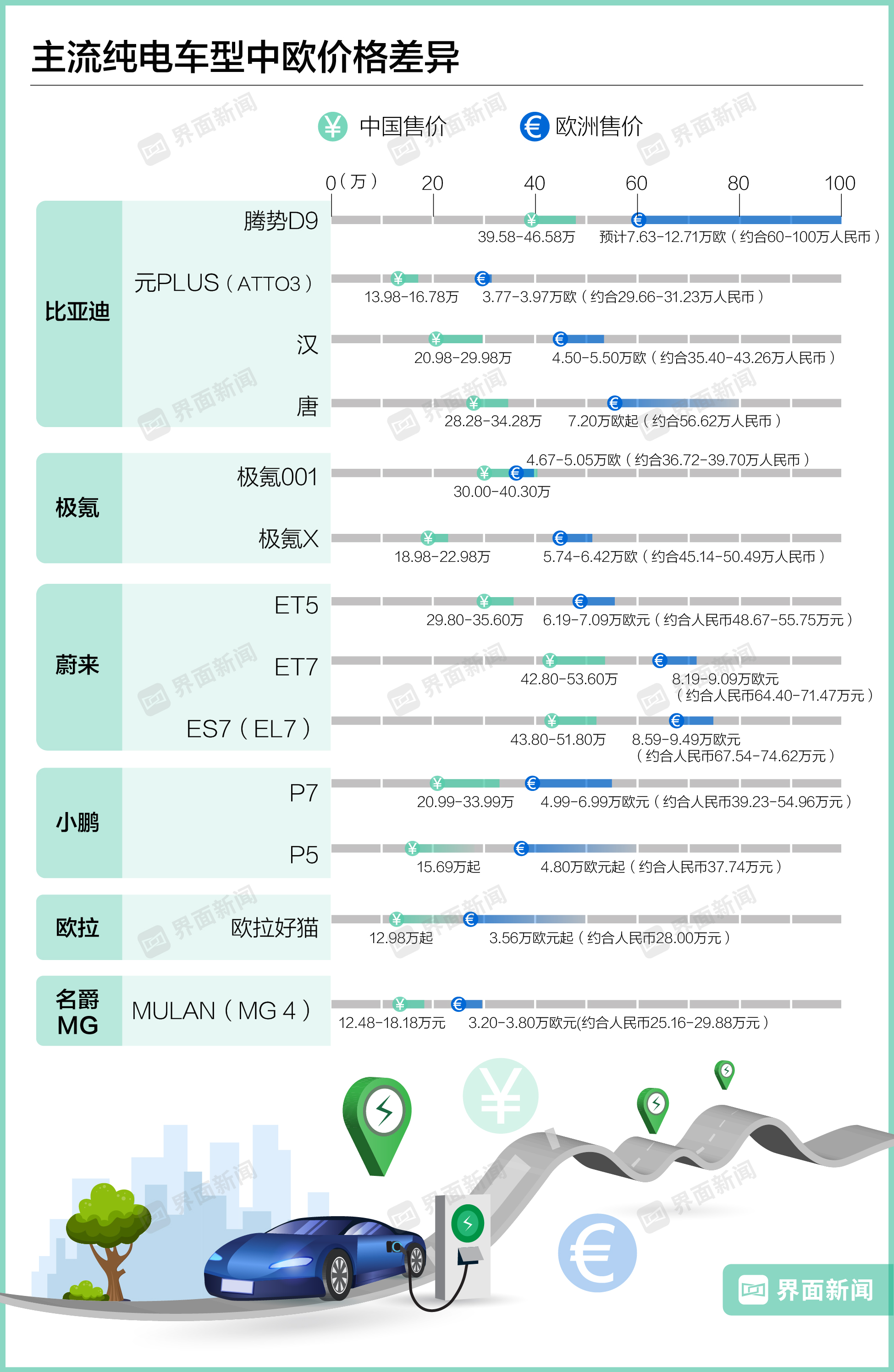比亚迪与奔驰的合资品牌腾势(双方持股比例为9:1)旗下的腾势D9国内指导价39.58万起,该品牌总经理赵长江曾在其个人社交平台上表示,车型进入欧洲、中国香港及澳门地区后,销售价格将在60至100万人民币。新势力品牌极氪、蔚来、小鹏的在售车型中,欧洲市场价格普遍为中国市场指导价的1.5至2倍。传统汽车制造商方面,长城新能源品牌欧拉和上汽旗下名爵MG欧洲市场起售价较国内同样价格翻倍。