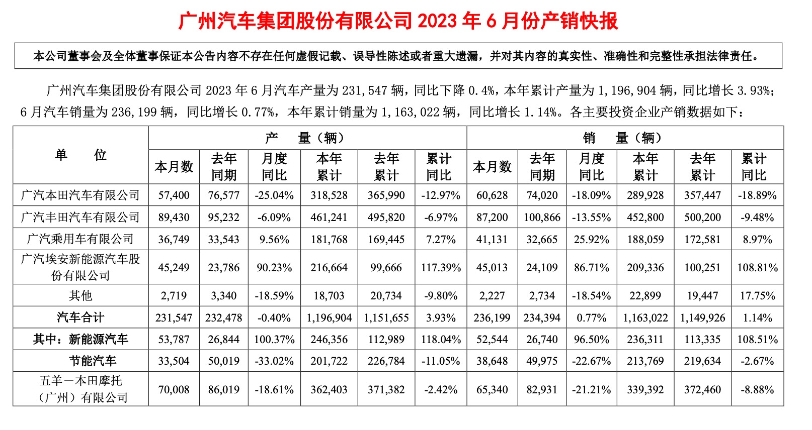 广汽集团7月5日公告,6月汽车产量为231,547辆,同比下降0.4%,本年累计产量为1,196,904辆,同比增长3.93%;6月汽车销量为236,199辆,同比增长0.77%,本年累计销量为1,163,022辆,同比增长1.14%。其中,6月新能源汽车销量52,544辆,同比增长96.50%。