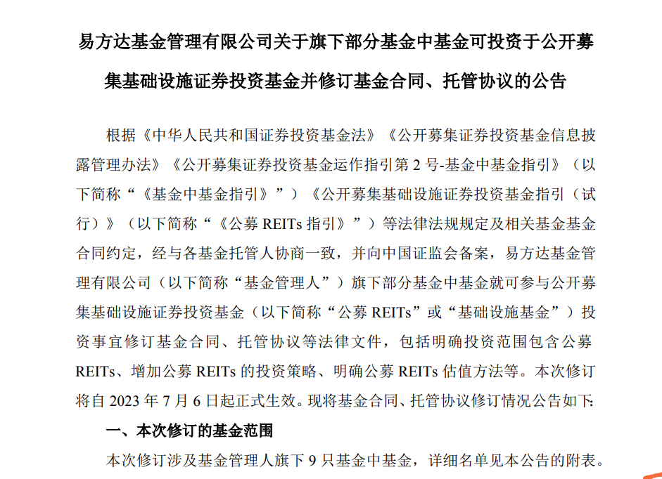 公募REIT市场又有大消息。昨日晚间, 易方达、南方、银华、东方红资产管理、天弘等多家基金管理人纷纷发布公告称,公司旗下部分FOF基金将公募REITs纳入投资范围。