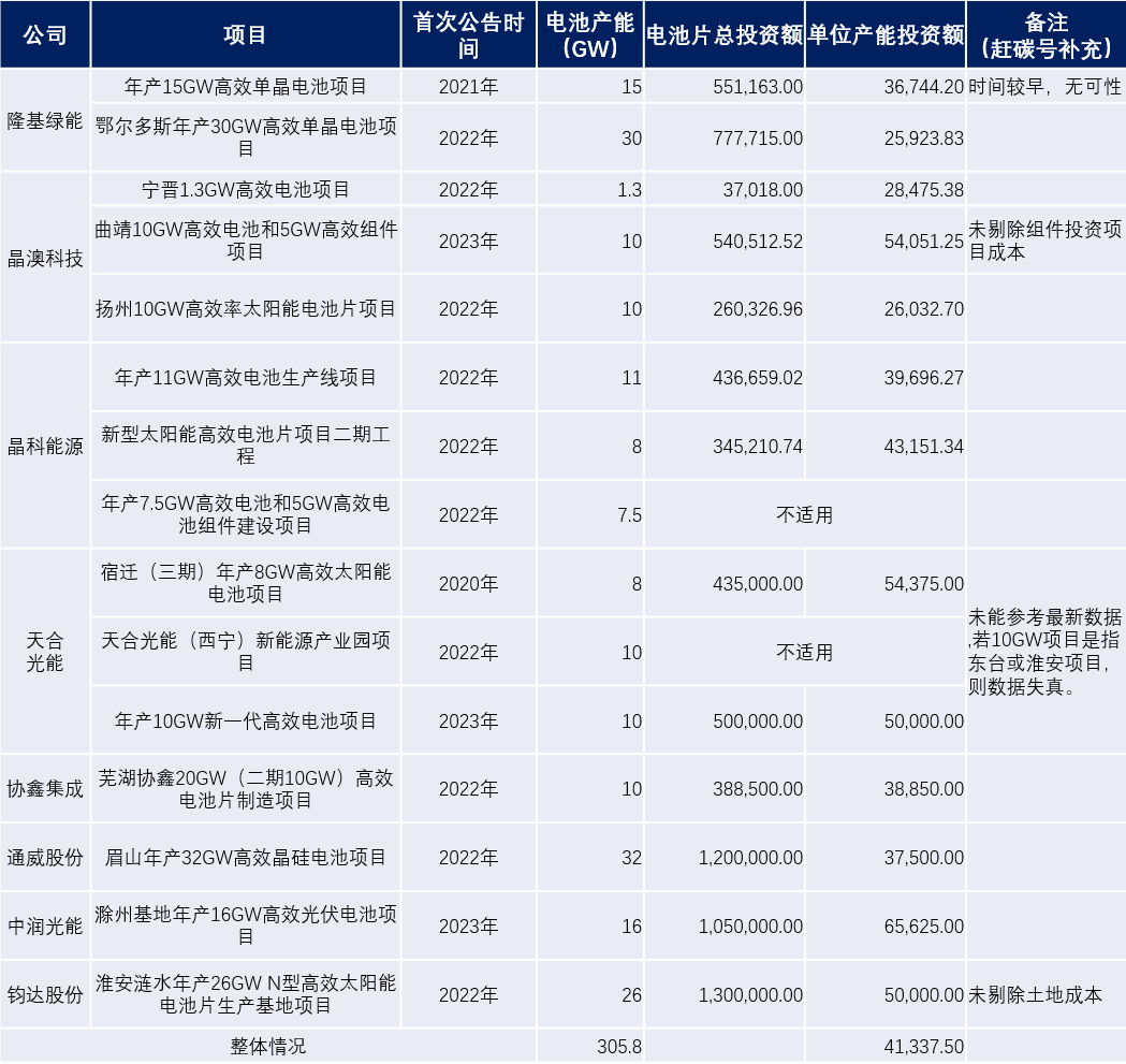 其一,TOPCon设备和投资成本,下降速度很快,再以隆基绿能2021年的数据做为参照,并不合适。其二,晶澳科技曲靖项目包含部分组件,应当剔除,否则亦不能反映真实投资成本。其三,天合光能电池片项目,所节选数据陈旧,且未能反映真实投资成本。