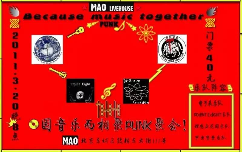 二飞一直记得乐队第一次在MAO演出的场景。那是一场名为“因音乐而相聚PUNK聚会”的演出。“我们心情特好,那天是一个朋克场,虽然我们一点也不朋克”。