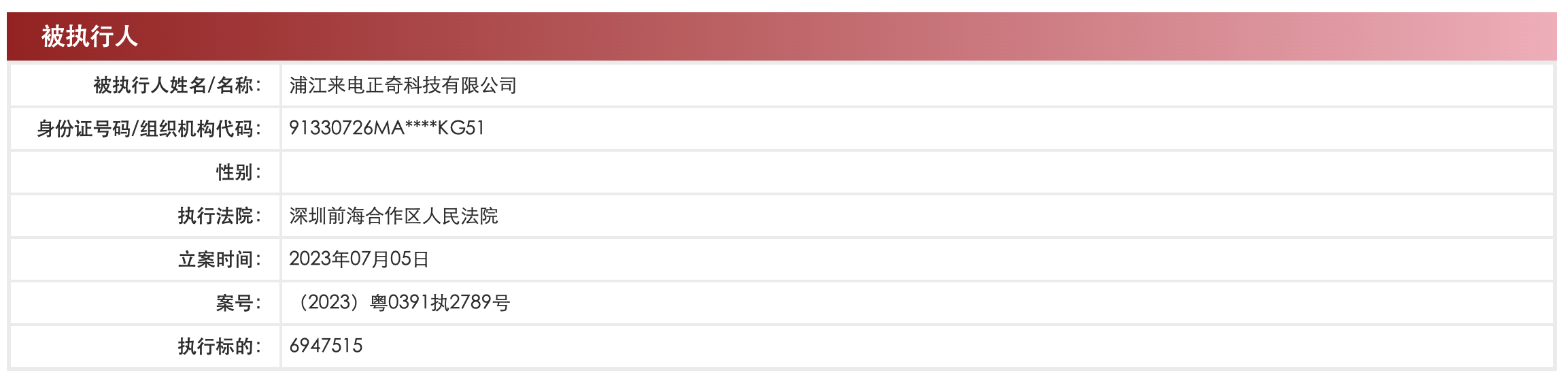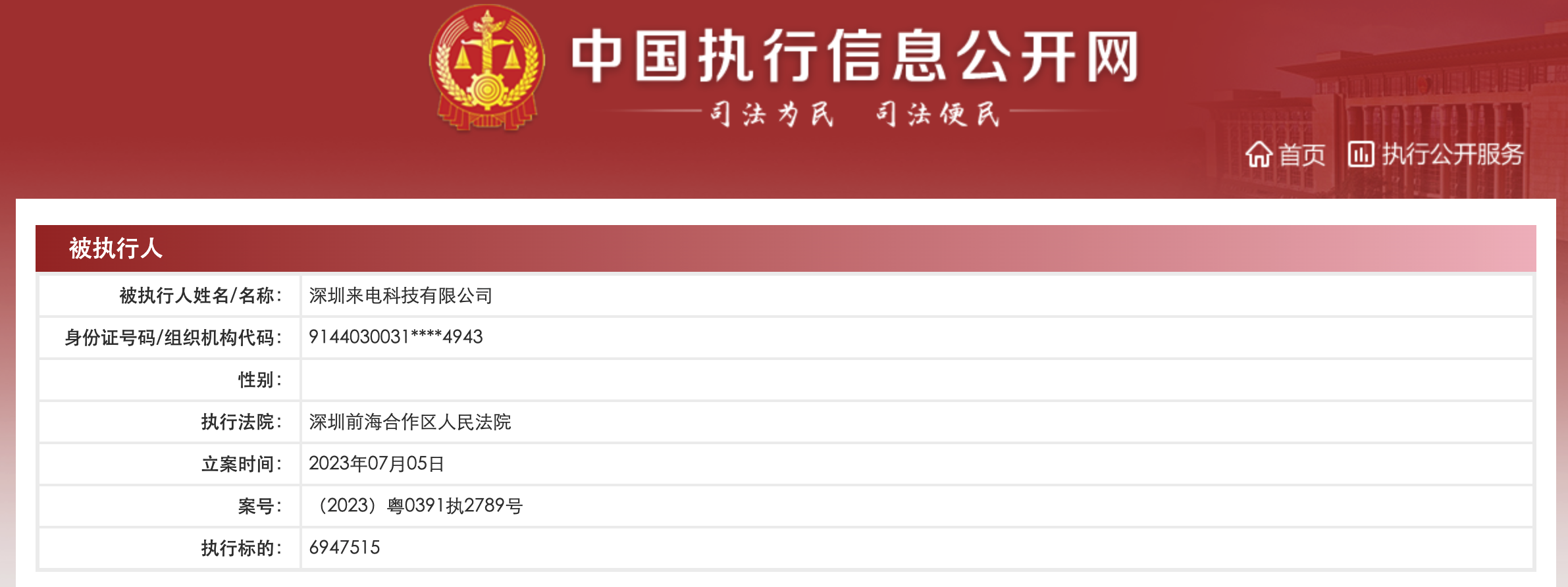 中国执行信息公开网显示,7月5日,深圳来电科技有限公司及其股东浦江来电正奇科技有限公司,新增一则被执行人信息,执行标的694万余元,执行法院为深圳前海合作区人民法院。