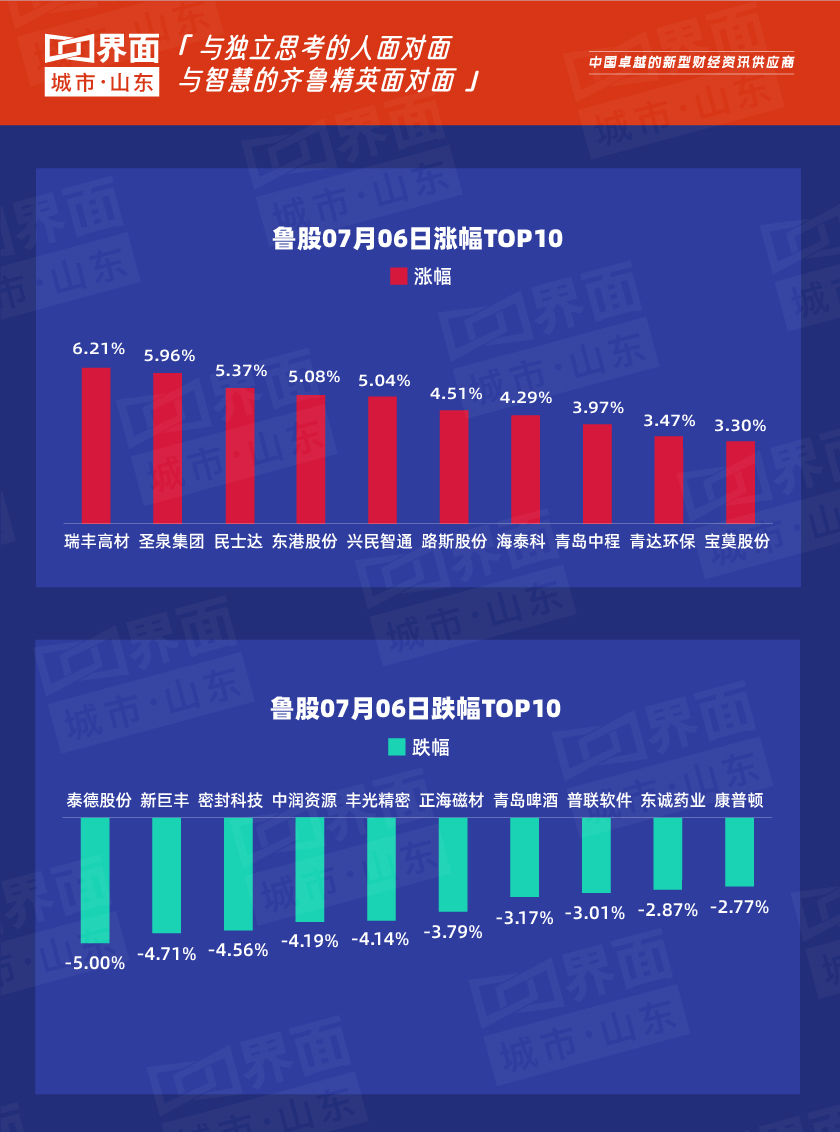 7月6日,山东省内沪深京股票有98只个股上涨,189只个股下跌。