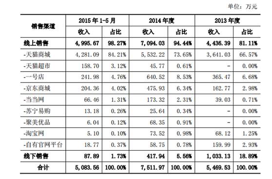 2013年-2014年,猫诚电商自有官网平台销售额占公司总营收比例从2.93%降至0.78%,线下销售比例也从18.89%降至5.56%,而第三方商务平台的销售占比则从78.18%上升至93.66%。2015年1-5月,第三方平台的销售额占猫诚电商总营收比例已经达到97.9%。