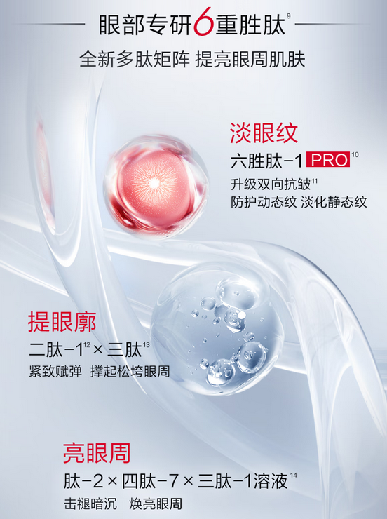 “弹性蛋白”对眼部肌肤至关重要。要知道,眼睛每天要眨眼折叠上万次,通过六胜肽缓解动态纹还不够,必须让这块肌肤保持高回弹能力,才能抵御这么高强度的机械折叠。所以珀莱雅红宝石眼霜 2.0 在原本促生胶原蛋白的基础上,聚焦熟龄肌的弹性蛋白纤维流失问题,针对性“眼部六重胜肽”提升眼部结构支撑弹性,加固组装“胶原纤维”和“弹性纤维”,让眼周肌肤撑起来,肌肤骨架更加结实。
