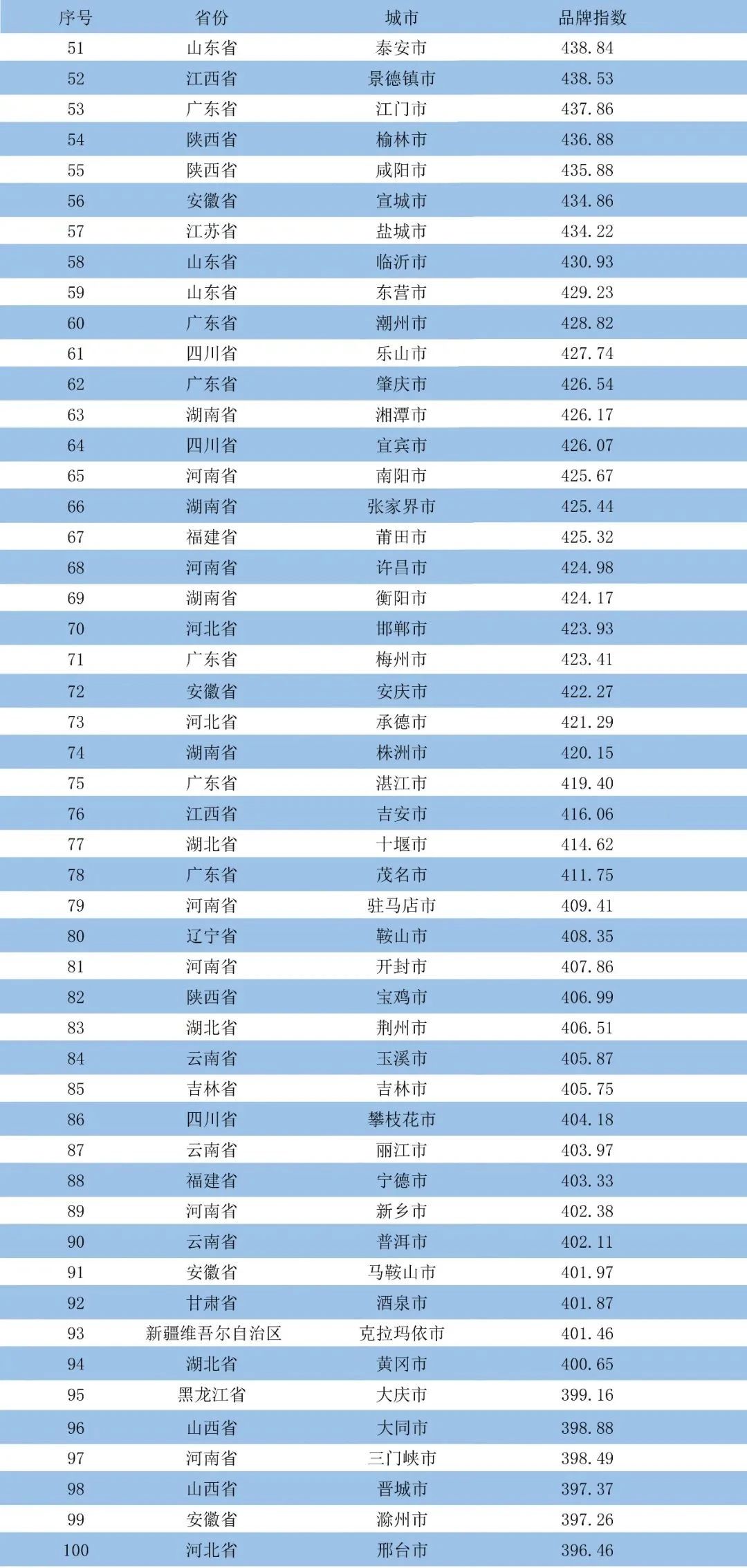 本次评价运用近两年的国家统计数据,对全国293个地级市(不含省会以上城市)进行标准化分析,最终计算出各城市品牌综合影响力指数,发布前100名城市名单。