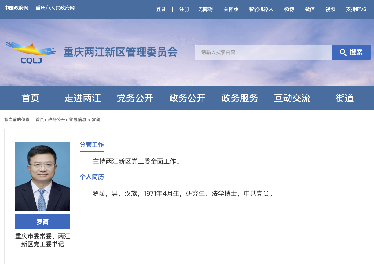 7月6日,重庆两江新区管委会官网“领导信息”栏目显示,罗蔺已任重庆市委常委、两江新区党工委书记,主持两江新区党工委全面工作。罗蔺此前任重庆市委常委、秘书长。
