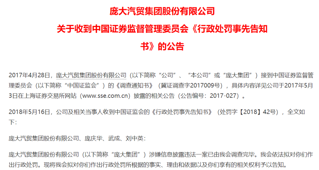 2017年4月28日,因涉嫌违反证券法律法规,庞大集团收到证监会《调查通知书》。一年后的5月16日,庞大集团发布关于收到中国证券监督管理委员会《行政处罚事先告知书》的公告。证监会认为,庞大集团以及实控人庞庆华涉嫌未如实披露权益变动情况,未按规定披露关联交易,未披露自身涉嫌犯罪被司法机关调查等违法事实。对此证监会决定对庞大集团给予警告,并处60万元罚款;对庞庆华给予警告,并处以90万元罚款;对相关当事人武成、刘中英给予警告并处罚款。