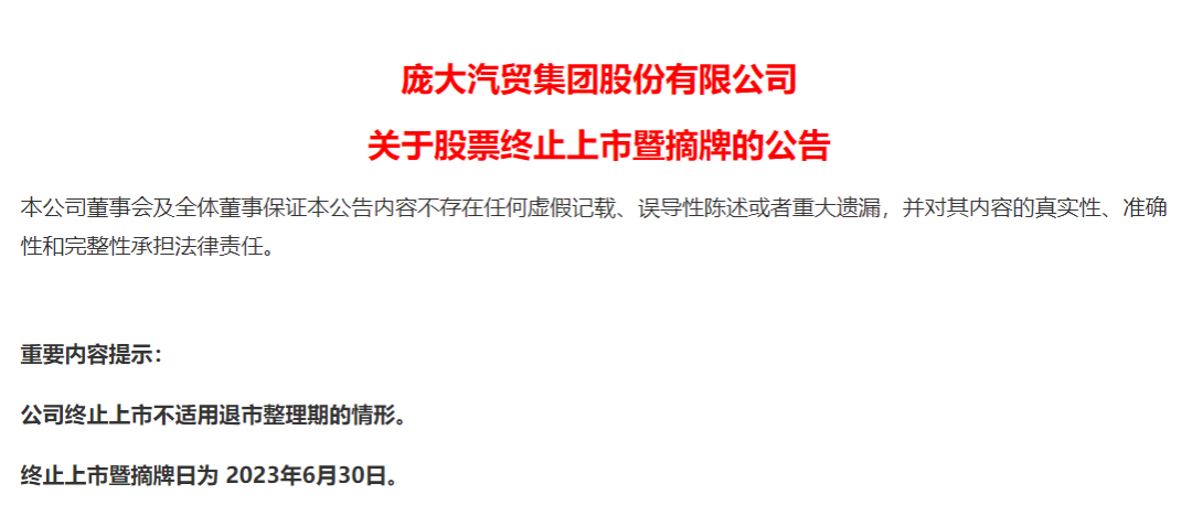 6月30日,上交所正式对庞大汽贸集团股份有限公司(简称庞大集团)股票予以摘牌,公司股票终止上市。