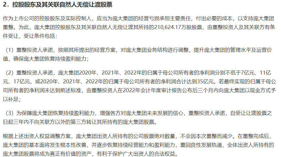 根据重整计划,庞大集团将以自有资金、重整投资人等来源提供7亿元用于支付重整费用、清偿债务及补充公司流动资金。重整投资人还将引入中国民生银行为庞大集团提供不超过10亿元的共益债务融资,用于补充公司流动资金。同时重整投资人承诺,庞大集团2020年、2021年、2022年的归属于母公司所有者的净利润分别不低于7亿元、11亿元、17亿元,或2020年、2021年、2022年的归属于母公司所有者的净利润合计达到35亿元。
