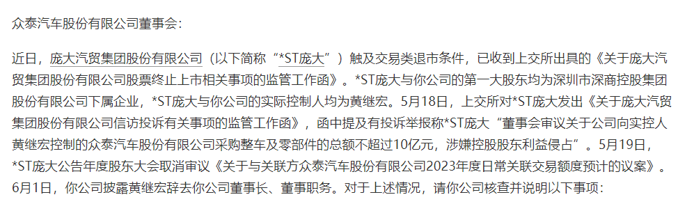 与此同时,深交所在向众泰汽车下发的关注函中提及:有人举报庞大集团现任实际控制人,同时也是深商集团总裁的黄继宏,涉嫌通过潜在关联方变相占用上市公司资金——公司董事会审议关于公司向黄继宏控制的众泰汽车股份有限公司采购整车及零部件的总额不超过10亿元。
