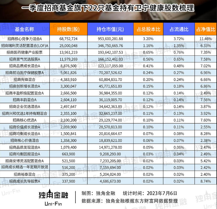 结合卫宁健康一季报和东方财富网数据,截至2023年一季度末,64家基金公司持有公司股份,合计持股数为2.44亿股,其中招商基金旗下共有22只基金持有卫宁健康1.62亿股,占流通股的比例为8.76%。