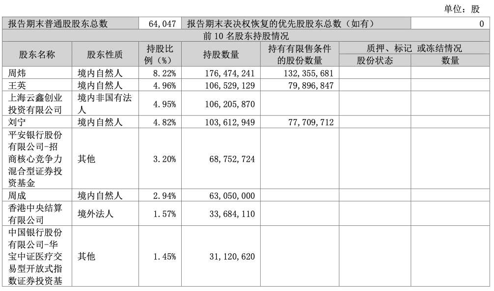 截至2023年一季度末,周炜持股8.22%,王英持股4.96%,分别位列第一、二大股东;上海云鑫创业投资有限公司持股4.95%,为第三大股东;此外,刘宁持股4.82%,周成持股2.94%,位列第四、六股东。
