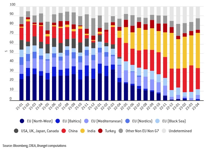 俄油出口转向中,中印市场发挥了“中流砥柱”的作用,接替欧洲成为俄油出口的主要市场,其中印度作用尤其显著。
