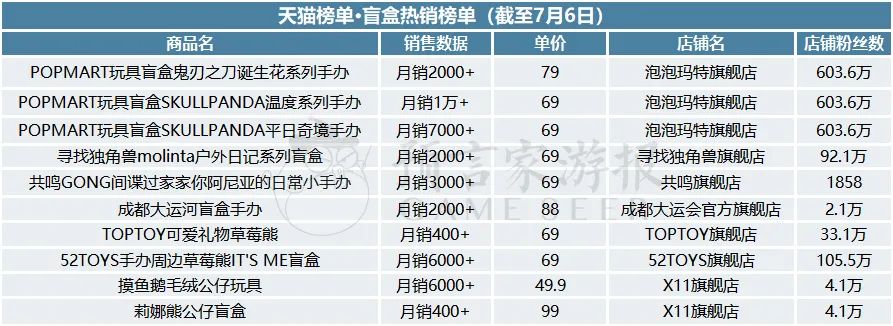 2023年6月,泡泡玛特的鬼刃之刀诞生花系列、SKULLPANDA温度系列、SKULLPANDA平日奇境系列占据盲盒榜单前三。游戏IP衍生手办热度不减。IP衍生品头部市场格局相对稳定,尾部排名略有浮动。今天让我们盘点一下6月的文创衍生品及潮玩产品的销售数据。
