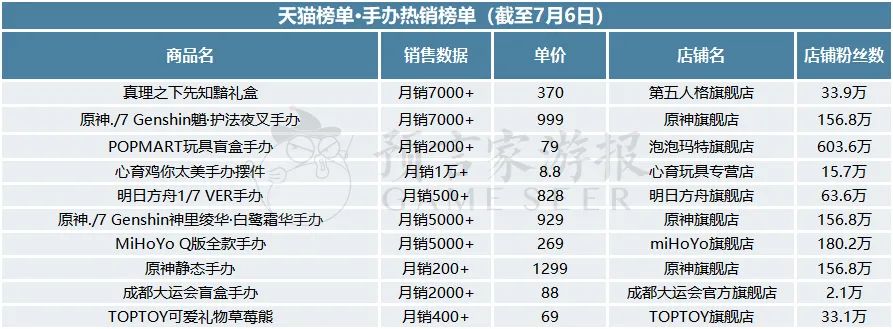 在手办热销榜单中,游戏IP衍生手办热度持续走高。第五人格的真理之下先知黯礼盒占据榜首,月销7000+。原神在榜单中独占三席,原神./7 Genshin魈·护法夜叉手办、原神./7 Genshin神里绫华·白鹭霜华手办、原神静态手办分别占据了第二、第六、第八的位置。而明日方舟1/7 VER手办和MiHoYo Q版全款手办则分别排名第五名和第七名。