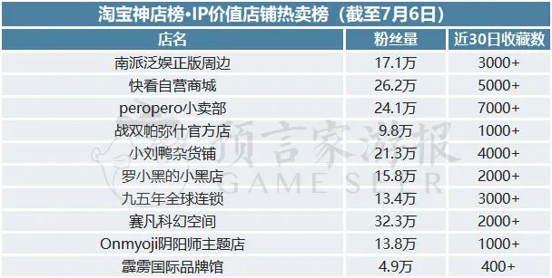 其他位于前十的店铺分别为peropero小卖部、战双帕弥什官方店、小刘鸭杂货铺、罗小黑的小黑店、九五年全球连锁、赛凡科幻空间、Onmyoji阴阳师、霹雳国际品牌馆。
