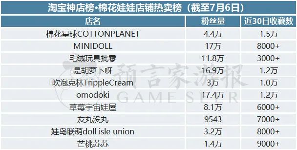 棉花娃娃店铺热卖榜上,棉花星球COTTONPLANET蝉联第一,MINIDOLL和毛绒玩具批零分别上升到第二位,第三位。