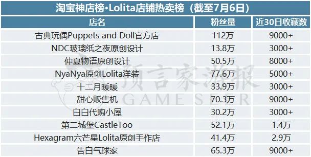 Lolita店铺热卖榜上,古典玩偶Puppets and Doll官方店稳居第一,近30日内获得9000+收藏量,NDC玻璃纸之夜原创设计从第8位跃升至第2位,近30日内获得3000+收藏量。