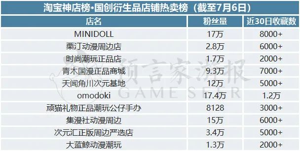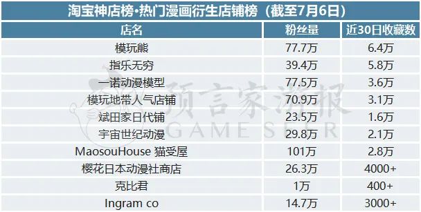 首先是漫画衍生品。前5名已经连续三个月没有变化,分别为模玩熊、指乐无穷、一诺动漫模型、模玩地带人气店铺、斌田家日代铺五家店铺,近30日收藏数分别为6.4万、5.8万、3.6万、3.1万、1.6万。五家店铺都以贩卖动漫模型以及特摄周边为主。本月新上榜的则是克比君和Ingram co,近30日内分别收获了400+和3000+的收藏数。