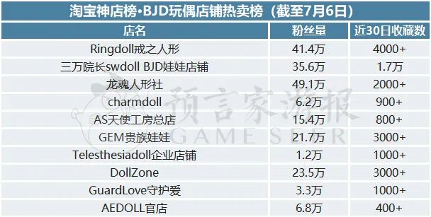 本月,在淘宝神店榜的BJD玩偶店铺热卖榜中,排在前十的分别是Ringdoll戒之人形、三万院长swdoll BJD娃娃店铺、龙魂人形社、charmdoll、AS天使工房总店、GEM贵族娃娃、Telesthesiadoll企业店铺、DollZone、GuardLove守护爱、AEDOLL官店。