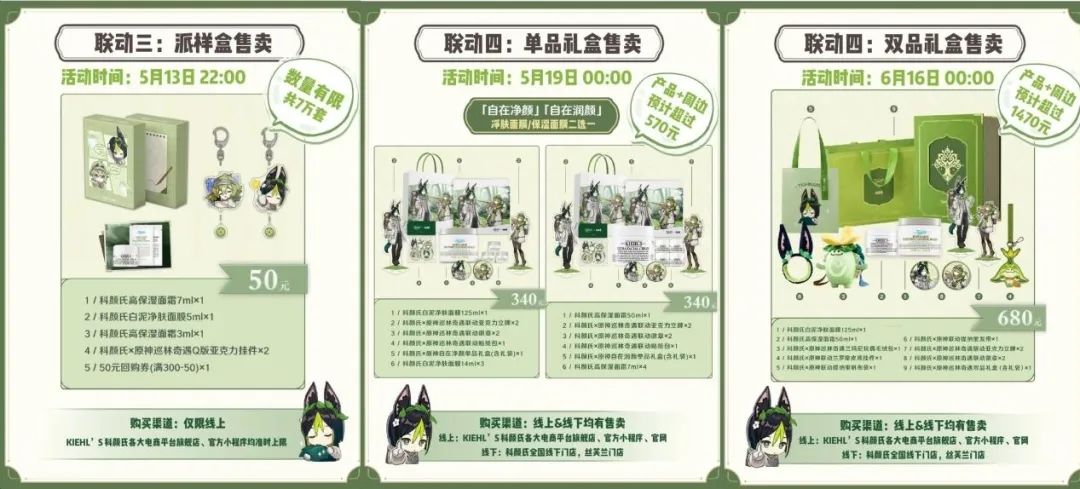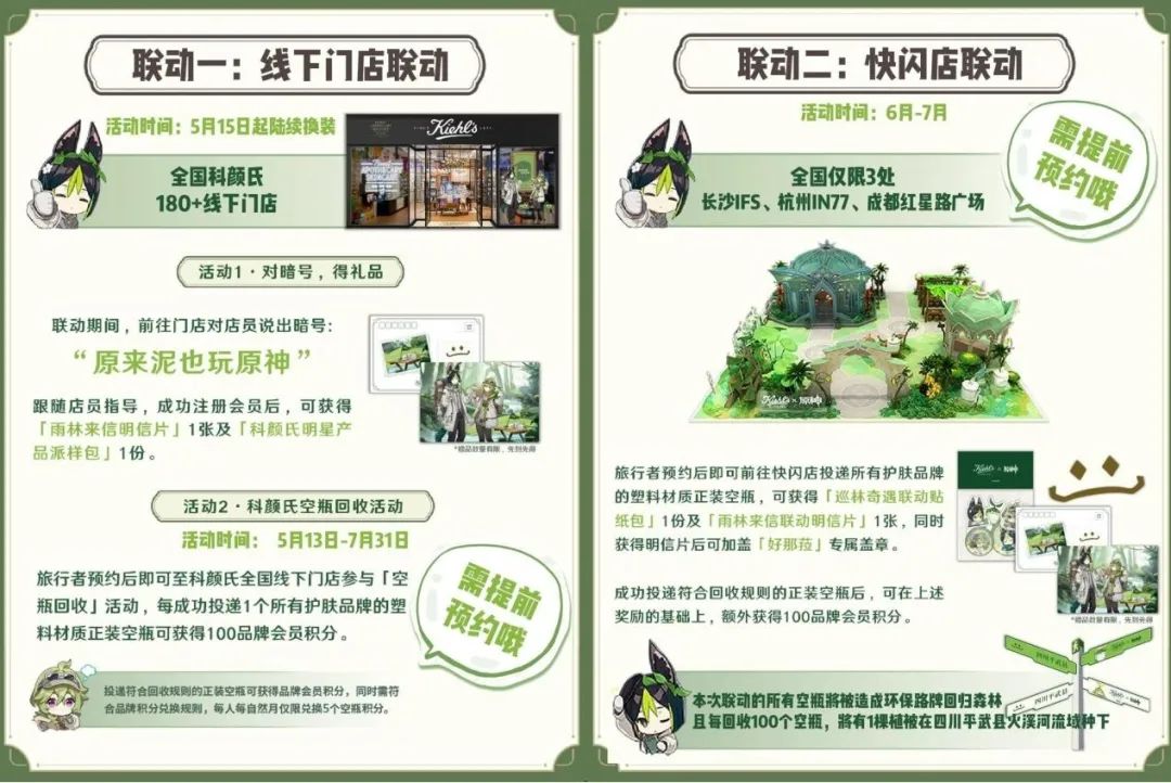 5月,科颜氏联名活动叫“巡林奇遇,自在净颜”。不仅推出了“巡林奇遇派样盒”、“单品礼盒”、‘双品礼盒’三款礼盒,还在全国线下门店开启联动换装,消费者与店员说出暗号“原来泥也玩原神”,并跟随店员指导成功注册会员,就能获得张“雨林来信联动明信片”以及1份“科颜氏明星产品派样包”。此外,发起的环保委托“空瓶回收”公益活动。