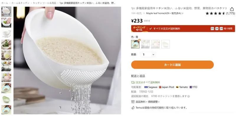像是类似设计的淘米用具,Temu上卖278日元包邮,预估的送货时间需要一周左右,不论是大创还是Seria,110日元就能买到类似产品不说,并且几乎不难在10分钟的步行范围内找到这两家或是别的百元店店铺。