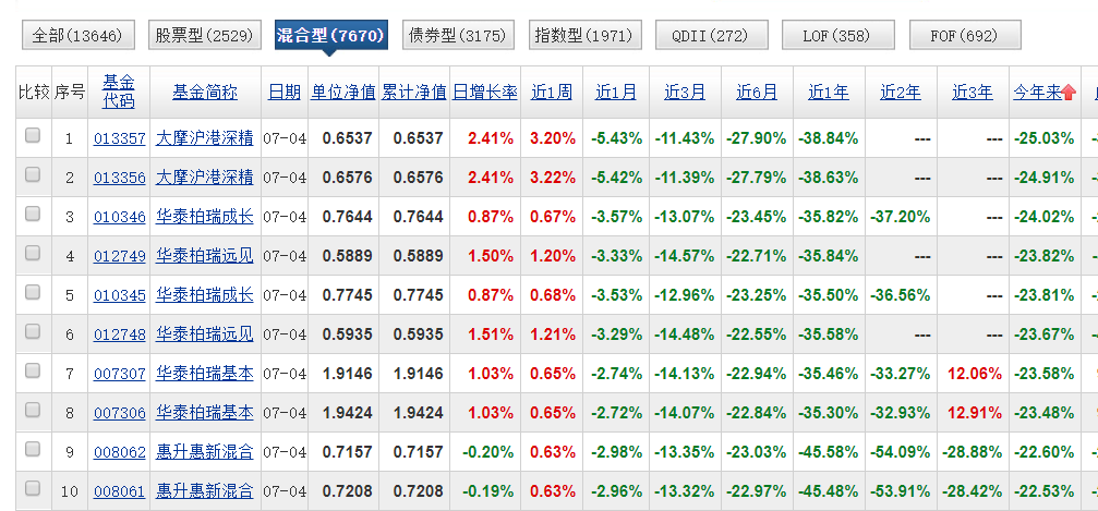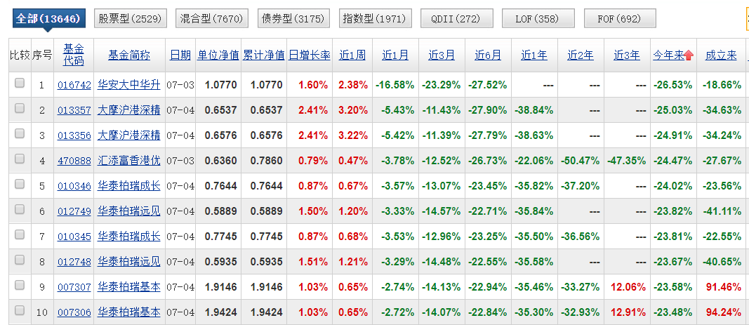 01、6只基金上半年跌超20%,在13642只开放式基金中倒数前10