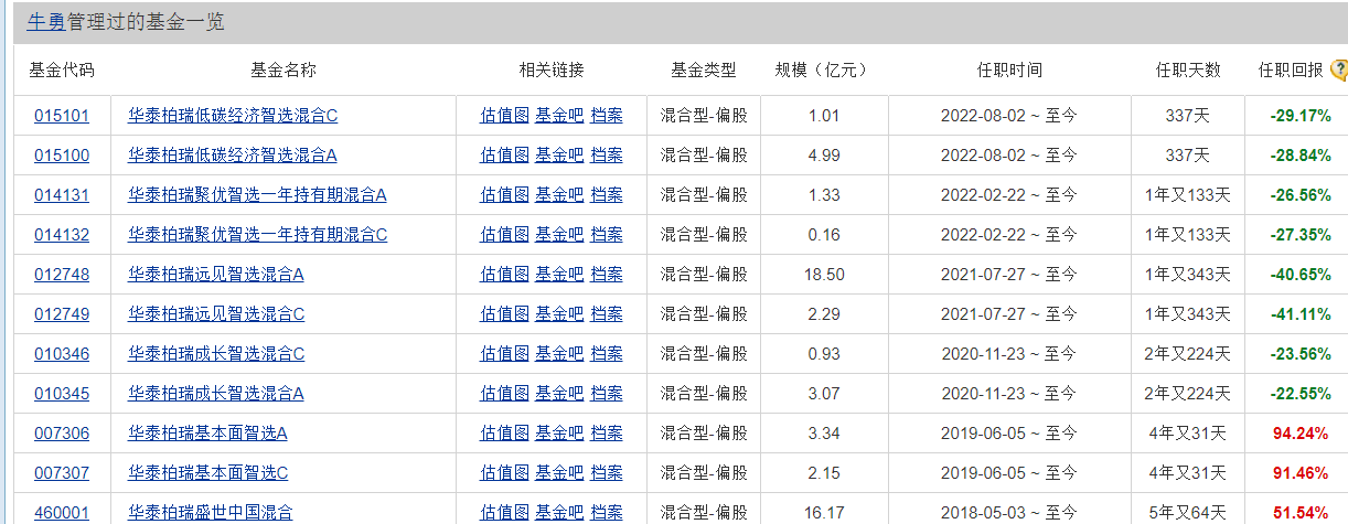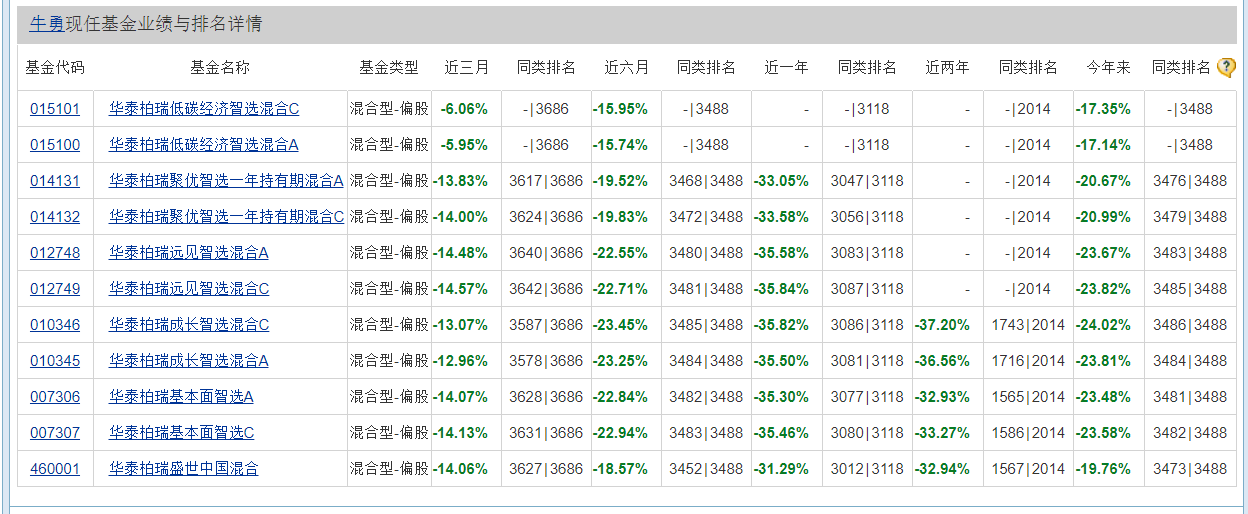 进一步查看华泰柏瑞这6只业绩倒数的基金,公司研究室发现,其基金经理竟然都是牛勇。