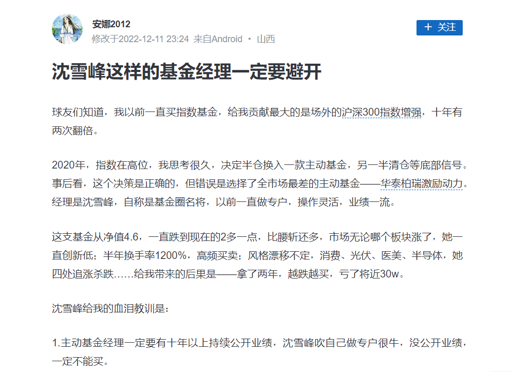 在知乎上,有个网名安娜2012的人,2022年12月11日,发文称:2020年,指数在高位,她思考很久,决定半仓换入一款主动基金,另一半清仓等底部信号。当时,她选择了沈雪峰管理的华泰柏瑞激励动力。